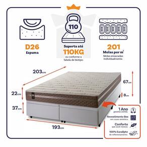 - Altura: 22 cm (colchão) + 37 cm (box baú) + 8 cm (pés) = 67 cm de altura;