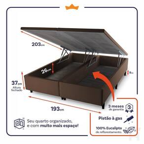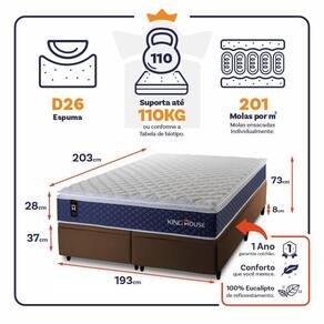 - Altura: 28 cm (colchão) + 37 cm (box baú) + 8 cm (pés) = 73 cm de altura;
