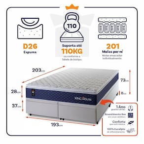 - Altura: 28 cm (colchão) + 37 cm (box baú) + 8 cm (pés) = 73 cm de altura;