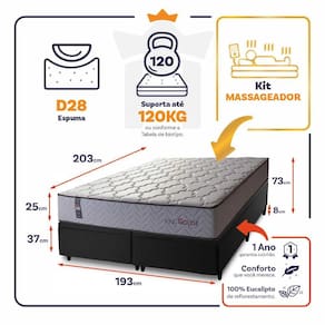 - Altura: 25 cm (colchão) + 37 cm (box) + 8 cm (pés) = 70 cm de altura.