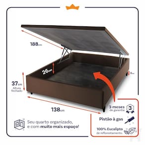 - Altura: 24 cm (colchão) + 37 cm (box baú) + 8 cm (pés) = 69 cm de altura;