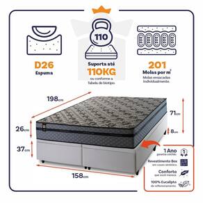 Medidas do Colchão: 88x188x26 cm, 96X203x26 cm, 138x188x26 cm, 158x198x26 cm.