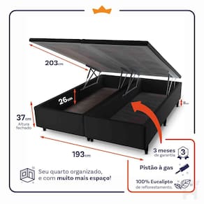 - Altura: 29 cm (colchão) + 37 cm (box baú) + 8 cm (pés) = 74 cm de altura;