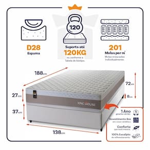 - Altura: 27 cm (colchão) + 37 cm (box baú) + 8 cm (pés) = 72 cm de altura;