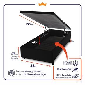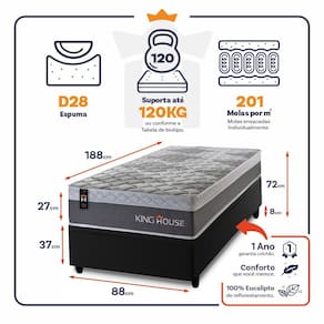 - Altura: 27 cm (colchão) + 37 cm (box baú) + 8 cm (pés) = 72 cm de altura;