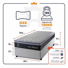 O Colchão Dakota é feito com os mais nobres materiais em sua composição, ele conta com espuma D33. Por ser mais macio, o colchão traz benefícios e ajuda no alinhamento da coluna. O colchão King House acomoda melhor o contorno do corpo, dispondo de forma correta quadris e ombros, expulsando as dores e problemas de coluna.