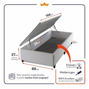 - Altura: 19 cm (colchão) + 37 cm (box baú) + 8 cm (pés) = 64 cm de altura;