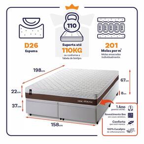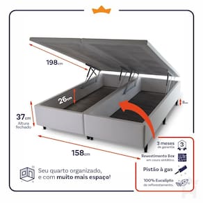 - Altura: 22 cm (colchão) + 37 cm (box baú) + 8 cm (pés) = 67 cm de altura;