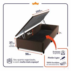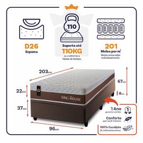 - Altura: 22 cm (colchão) + 37 cm (box baú) + 8 cm (pés) = 67 cm de altura;