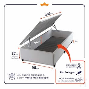 - Altura: 22 cm (colchão) + 37 cm (box baú) + 8 cm (pés) = 67 cm de altura;