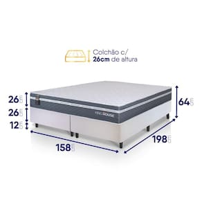 - Altura: 52 cm (colchão) + 12 cm (box) = 64 cm de altura;