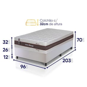 - Altura: 58 cm (colchão) + 12 cm (box) = 70 cm de altura;