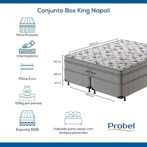 A espuma do Conjunto Box King Napoli foi desenvolvida com a Tecnologia ProMax Probel, que passa por rigorosos testes de qualidade em laboratório e recebe tratamento antiácaro e antifungo.