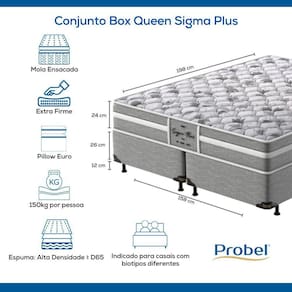 A espuma do Conjunto Box Queen Sigma Plus foi desenvolvida com a Tecnologia ProMax Probel, que passa por rigorosos testes de qualidade em laboratório e recebe tratamento antiácaro e antifungo.