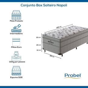A espuma do Conjunto Box Solteiro Napoli foi desenvolvida com a Tecnologia ProMax Probel, que passa por rigorosos testes de qualidade em laboratório e recebe tratamento antiácaro e antifungo.