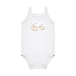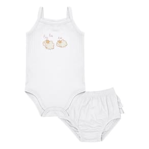 Básico e fofinho, não há quem resista ao conjunto ovelha! O conjunto conta com um body e uma calcinha super confortáveis e fresquinhos em tecido malha canelada na cor branca, o body possui aplique bordado de duas ovelhinhas fofinhas na parte da frente e a calinha possuí detalhes de frufru na parte de trás. Um charme para a diversão na casa da vovó ser garantida!