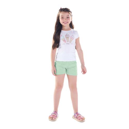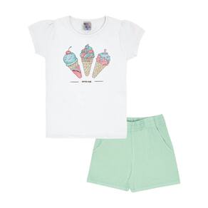 Ai que vontade de um sorvetinho e um lookinho! Para as meninas que vão aproveitar o dia quente com a priminha para tomarem um sorvete refrescante e delicioso aposte no conjunto sorvetinho, acompanha uma blusa cotton leve na cor branca e estampa frontal de três sorvetes com detalhes em strass na casquinha, já o short para combinar é confeccionado em tecido sarja na cor tiffany e possuí elastano no cós para as meninas poderem sentir-se leves e seguras no passeio. Que tal um sorvete flocos ou chocolate?
