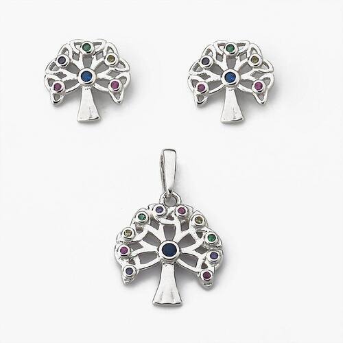 Conjunto Brinco E Pingente Arvore Da Vida Com Zircônias Prata 925 Conjunto Brinco E Pingente Arvore Da Vida Com Zircônias Prata 925 Colorida - Este conjunto de brincos e pingente Árvore da Vida em Prata 925 é adornado com zircônias coloridas, destacando uma zircônia azul no centro da árvore. Os detalhes delicados em cada galho brilham intensamente na prata polida, oferecendo uma elegância encantadora e atemporal.