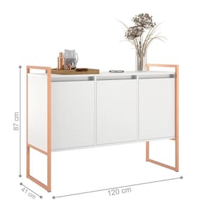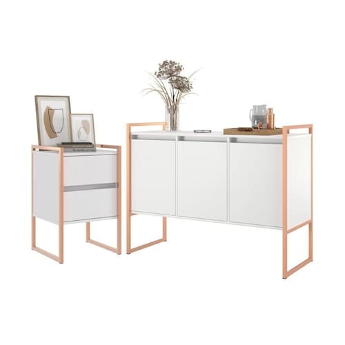 Com estrutura em aço 20x20, as peças apresentam durabilidade e estilo único. O buffet tem 3 portas e o gaveteiro possui duas gavetas espaçosas para organização. O acabamento em pintura epóxi proporciona um toque refinado e resistente.