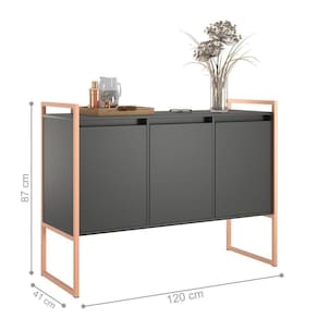 Com estrutura em aço 20x20, as peças apresentam durabilidade e estilo único. O buffet tem 3 portas e o gaveteiro possui duas gavetas espaçosas para organização. O acabamento em pintura epóxi proporciona um toque refinado e resistente.