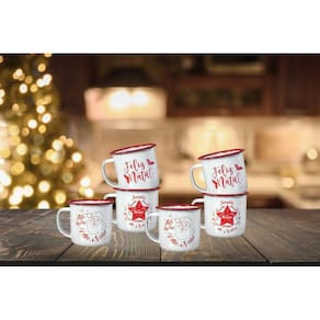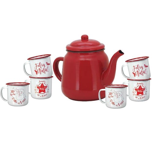 Jogo exclusivo com 6 unidades de canecas esmaltadas com 3 estampas natalinas diferentes! As canecas possuem a cor branca com estampa em vermelho, assim como sua borda e ainda um Bule Esmaltado Tradicional Vermelho com capacidade para 1700ml!