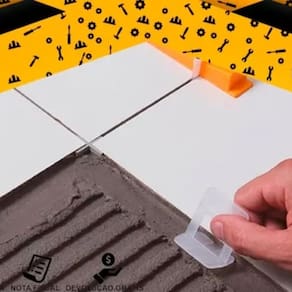 - Após a aplicação da argamassa, insira a base do espaçador/nivelador entre a argamassa e o piso, nos 4 lados. O clipe já funciona como um espaçador - Após o posicionamento dos espaçadores/niveladores finalize o assentamento do revestimento batendo com um martelo de borracha.