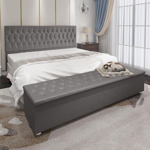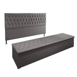 Conjunto Cabeceira Casal e Recamier Baú 1,95m Madrid Suede Cinza Dal Poz Estofados
