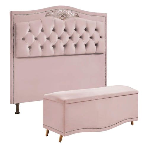 Conjunto Cabeceira e Calçadeira Holanda 140 cm Veludo Rosê Speciale Home - Rosa