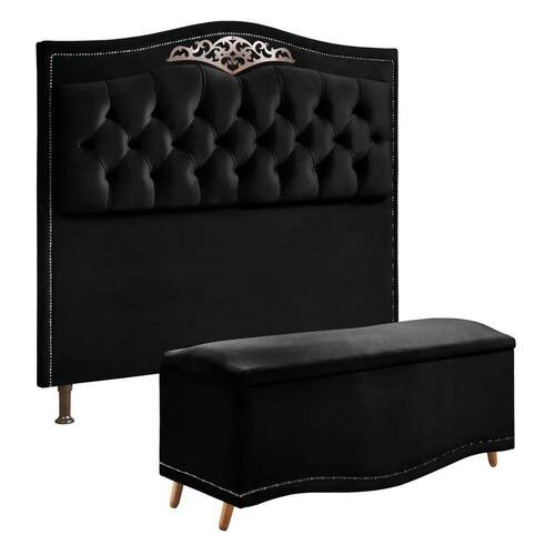 Conjunto Cabeceira e Calçadeira Holanda 90cm Veludo Shop das Cabeceiras - Preto