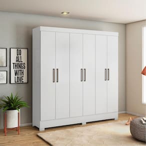 Possui 6 portas e 3 gavetas, todas com corrediças telescópicas e profundidade adequada para roupas e sapatos