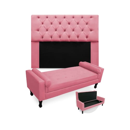 Conjunto Cabeceira Mirage Com Recamier Baú Fenix Queen 160 cm Suede Rosa Barbie - LM DECOR