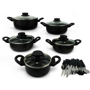 O Conjunto de 5 Panelas Caçarola é uma ótima escolha para quem quer equipar sua cozinha com produtos modernos e de boa qualidade, as panelas foram desenvolvida com alças térmicas e todo o conjunto é antiaderente para não deixar que os alimentos grudem no fundo das panelas, deixando tudo mais saboroso, além de ficar muito mais fácil na hora de lavar. Ótima para o preparo dos alimentos e com um fogão de cinco bocas, tudo pode ser preparado em sincronia. Possui tampas de vidro para você olhar o cozimento de seus alimentos com mais praticidade e rapidez, além de acompanhar 24 talheres