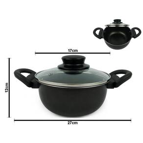 - Marca: Dona Chefa - Material: Alumínio teflon antiaderente - Material das tampas: Vidro temperado - Material Alças e Poméis: Baquelite - Cor: Preto - Formato: Circular - Revestimento: 5 camadas antiaderente - Possui tampa com saída de vapor: Sim - Pode ir a máquina de lavar louça: Sim - Pode ir ao micro-ondas: Não
