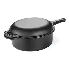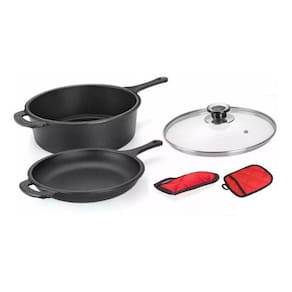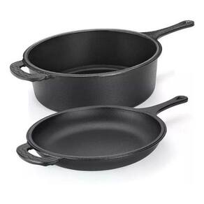 Conjunto Caçarola e Frigideira Multiuso de Ferro Fundido + Tampa de Vidro - 24CM Descrição: 2 produtos em 1 só, na parte de baixo uma caçarola com 25cm de diâmetro x 8cm de altura para preparar os mais variados alimentos, sua tampa de ferro é também uma frigideira, toda em ferro com 25cm de diâmetro x 4,5cm de altura. Pode ser utilizado como assadeira podendo ir direto ao forno para preparar pães, bolos e etc. Ideal para Arroz, bife, carnes, frango, feijão, caldos e etc. A caçarola é uma panela que apresenta uma grande versatilidade, pois tem o fundo plano e maior área de contato com a fonte de calor, cozinhando os alimentos uniformemente. Com a frigideira prepare carnes suculentas, peixes, ovos, omeletes, panquecas e todos os tipos de alimentos. Pode ser utilizada em vários tipos de fogão a gás e também a lenha. Maior durabilidade, condução e conservação de calor. Especificações do produto: Material: Ferro fundido. Dimensões frigideira : Profundidade: 4cm Diâmetro: 25 cm Comprimento cabo: 13cm Litragem: 1,5 Lts Dimensões Panela: Profundidade: 8cm Diâmetro: 25 cm Comprimento cabo: 13cm Litragem: 3,5 Lts Peso do conjunto: 5,8kg. Itens Inclusos: 01 Caçarola 25cm; 01 Tampa de Ferro (Modelo Frigideira) 25cm; 01 Tampa de Vidro 25cm (Serve tanto na caçarola como na Frigideira); 01 Pegador Térmico 01 Luva Térmica Produto plataforma Plast.