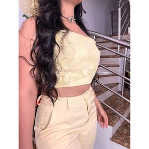 O conjunto é composto por duas peças na cor amarela. A parte de cima é um top cropped de alça fina, que apresenta um detalhe bordado em folhagens na frente. A parte de baixo é uma calça de perna larga, também conhecida como pantalona, que possui cintura alta e se estende até o chão, cobrindo os pés. Marca: Não Informado