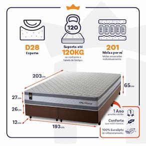 - Altura: 27 cm (colchão) + 26 cm (box) + 12 cm (pés) = 65 cm de altura;