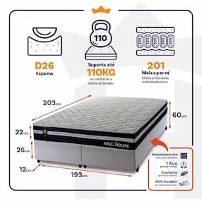 - Altura: 22 cm (colchão) + 26 cm (box) + 12 cm (pés) = 60 cm de altura;