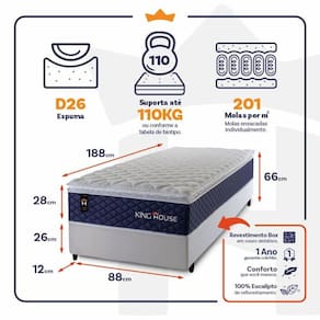 Feito com os mais nobres materiais em sua composição, ele conta com espuma D26 e molas ensacadas. Por ser mais macio, o colchão de molas ensacadas individualmente traz benefícios e ajuda no alinhamento da coluna. O colchão King House acomoda melhor o contorno do corpo, dispondo de forma correta quadris e ombros, expulsando as dores e problemas de coluna.