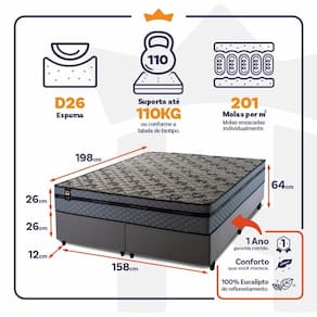 - Altura: 26 cm (colchão) + 26 cm (box) + 12 cm (pés) = 64 cm de altura;