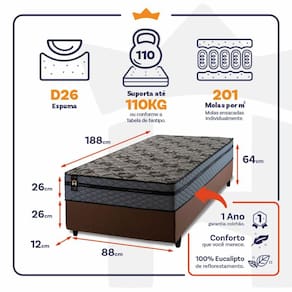 - Altura: 26 cm (colchão) + 26 cm (box) + 12 cm (pés) = 64 cm de altura;