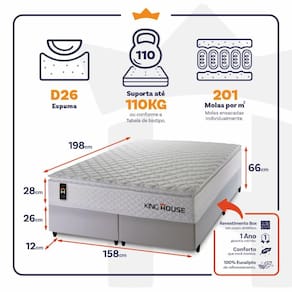 - Altura: 28 cm (colchão) + 26 cm (box) + 12 cm (pés) = 66 cm de altura;