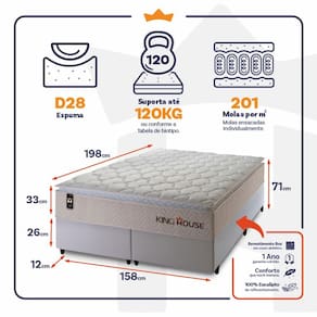 - Altura: 33 cm (colchão) + 26 cm (box) + 12 cm (pés) = 71 cm de altura;