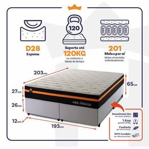 - Altura: 27 cm (colchão) + 26 cm (box) + 12 cm (pés) = 65 cm de altura;
