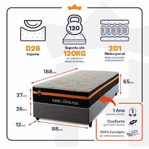 - Altura: 27 cm (colchão) + 26 cm (box) + 12 cm (pés) = 65 cm de altura;