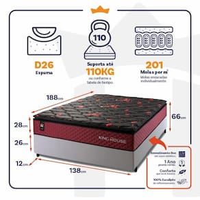 Feito com os mais nobres materiais em sua composição, ele conta com espuma D26 e molas ensacadas. Por ser mais macio, o colchão de molas ensacadas individualmente traz benefícios e ajuda no alinhamento da coluna. O colchão King House acomoda melhor o contorno do corpo, dispondo de forma correta quadris e ombros, expulsando as dores e problemas de coluna.