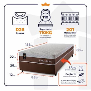 Feito com os mais nobres materiais em sua composição, ele conta com espuma D26 e molas ensacadas. Por ser mais macio, o colchão de molas ensacadas individualmente traz benefícios e ajuda no alinhamento da coluna. O colchão King House acomoda melhor o contorno do corpo, dispondo de forma correta quadris e ombros, expulsando as dores e problemas de coluna.