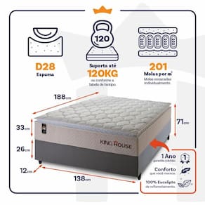 Feito com os mais nobres materiais em sua composição, ele conta com espuma D28 e molas ensacadas. Por ser mais macio, o colchão de molas ensacadas individualmente traz benefícios e ajuda no alinhamento da coluna. O colchão King House acomoda melhor o contorno do corpo, dispondo de forma correta quadris e ombros, expulsando as dores e problemas de coluna.