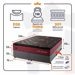 Feito com os mais nobres materiais em sua composição, ele conta com espuma D26 e molas ensacadas. Por ser mais macio, o colchão de molas ensacadas individualmente traz benefícios e ajuda no alinhamento da coluna. O colchão King House acomoda melhor o contorno do corpo, dispondo de forma correta quadris e ombros, expulsando as dores e problemas de coluna.