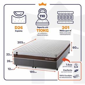 - Altura: 22 cm (colchão) + 26 cm (box) + 12 cm (pés) = 60 cm de altura;