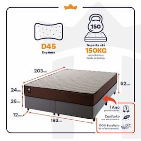 - Altura: 24 cm (colchão) + 26 cm (box) + 12 cm (pés) = 62 cm de altura;